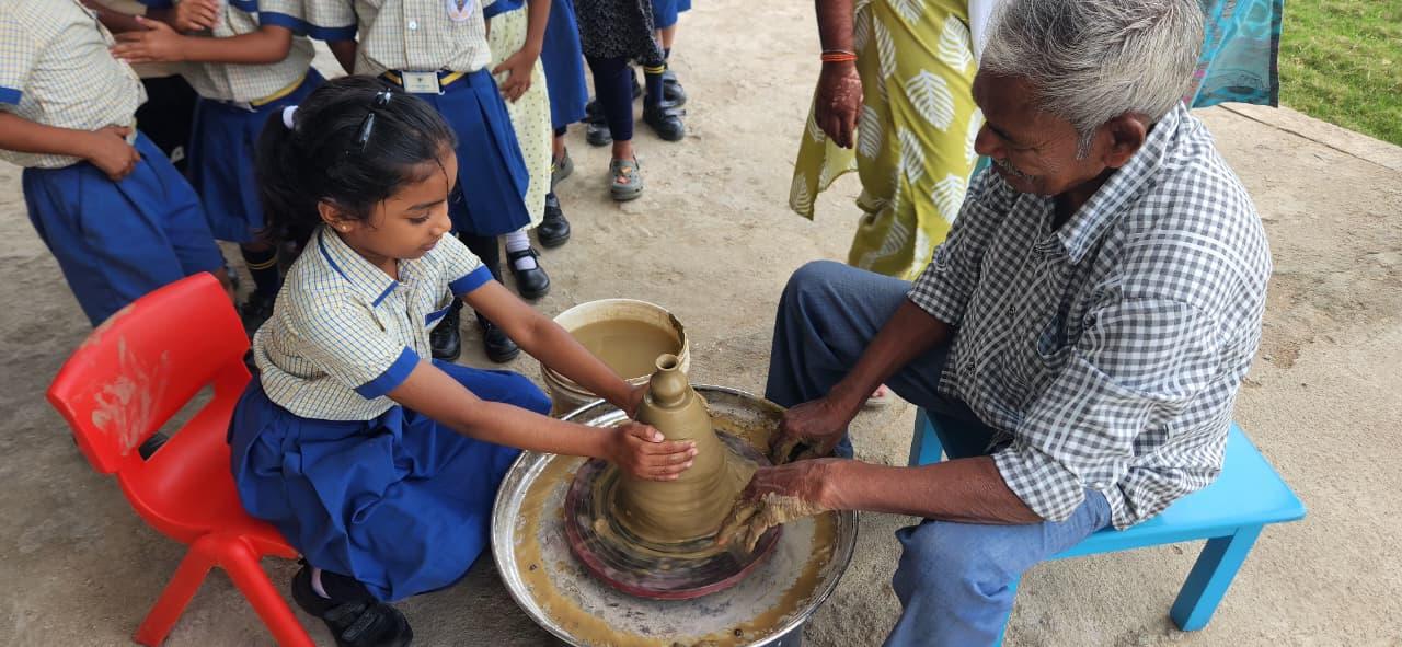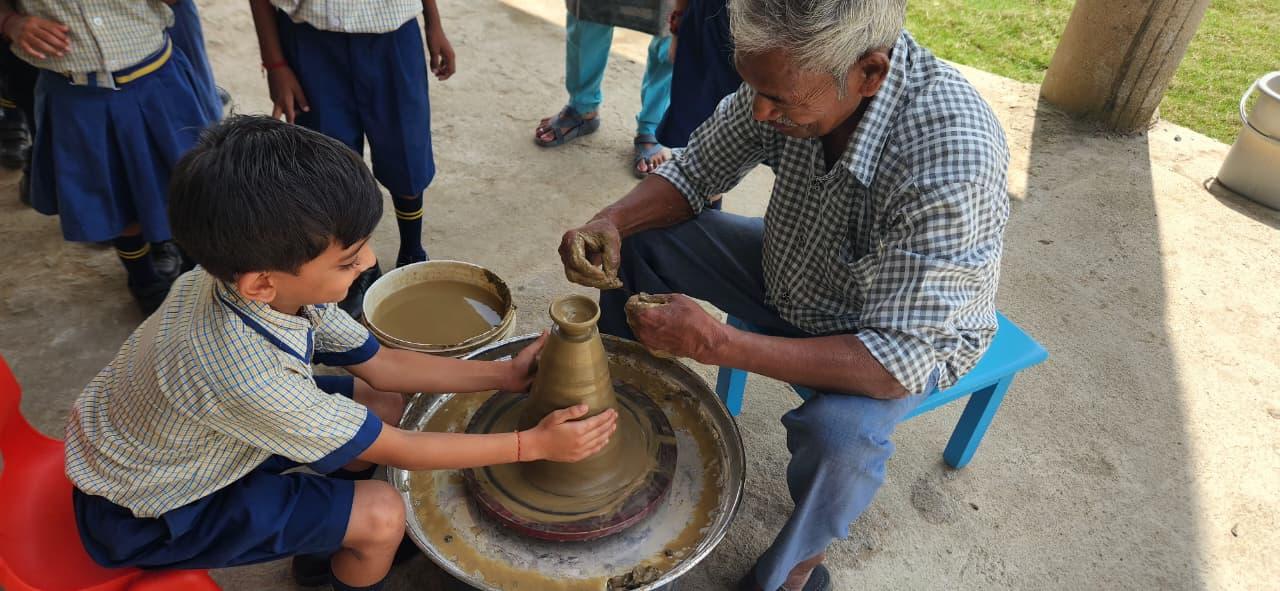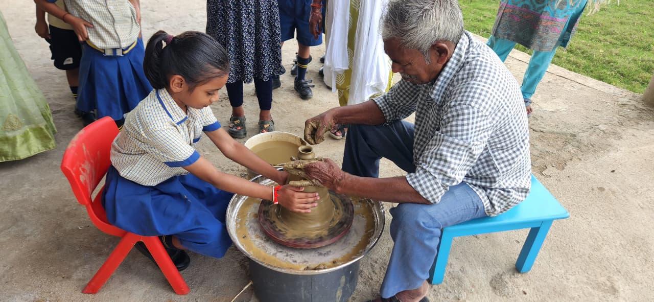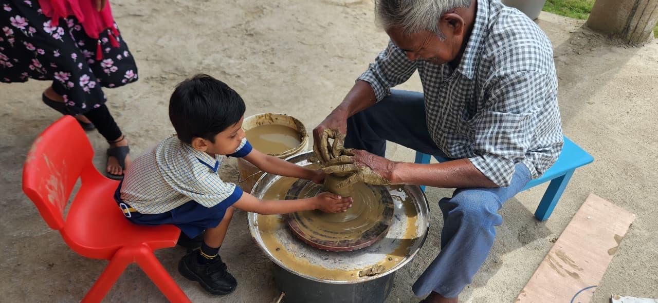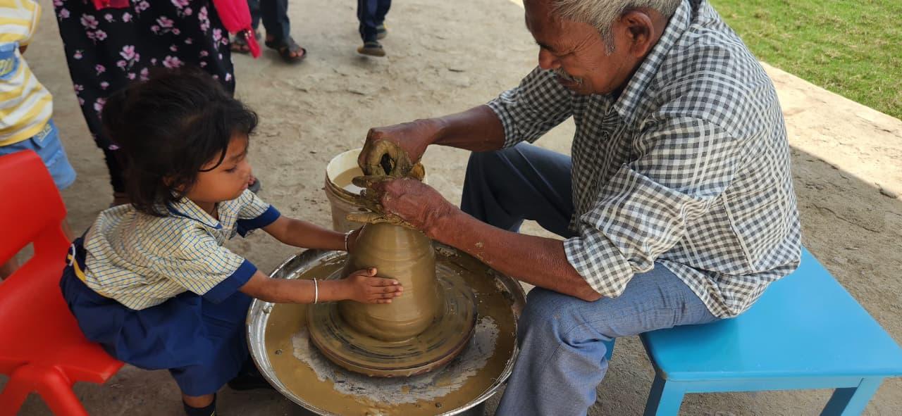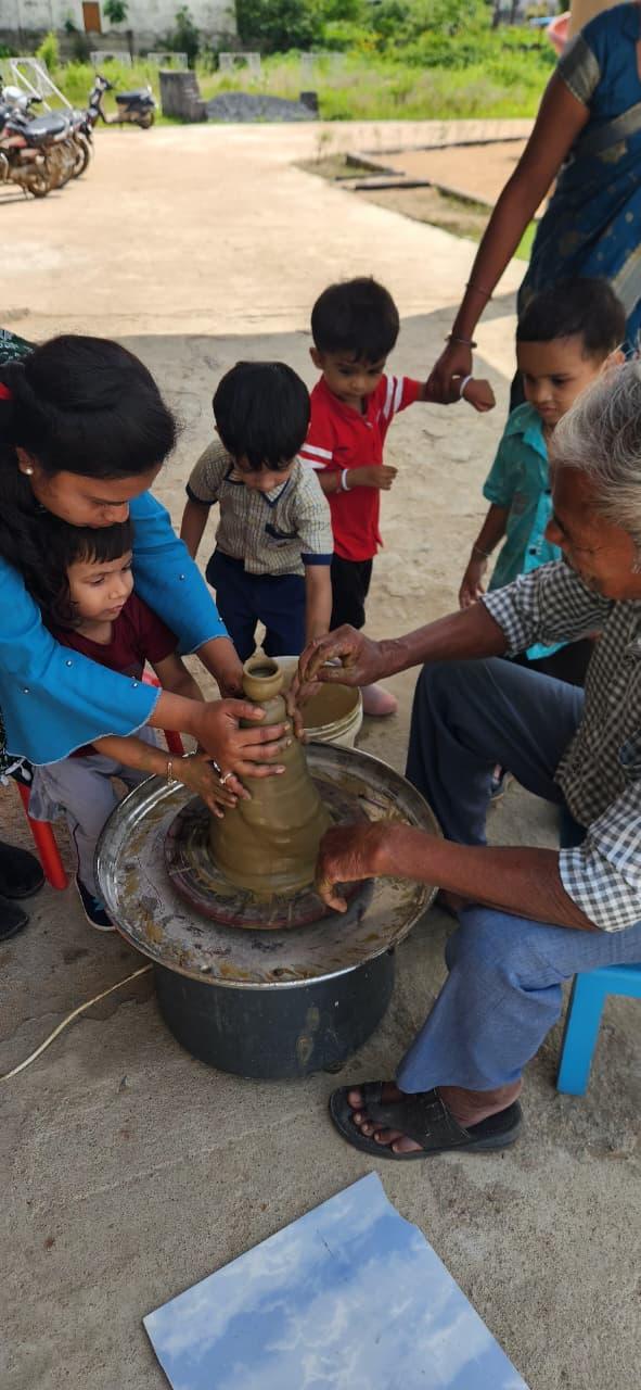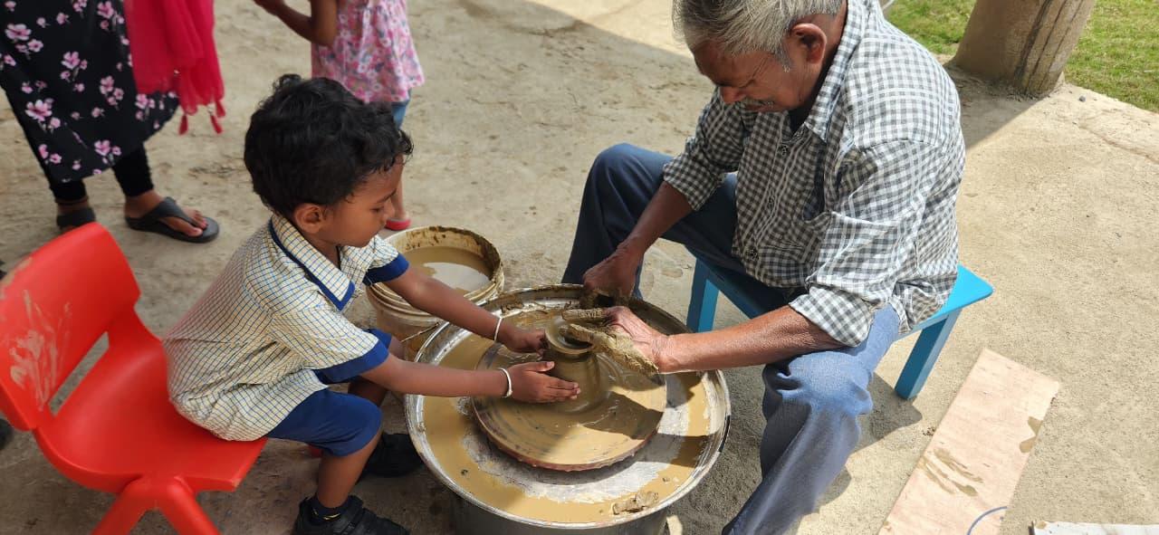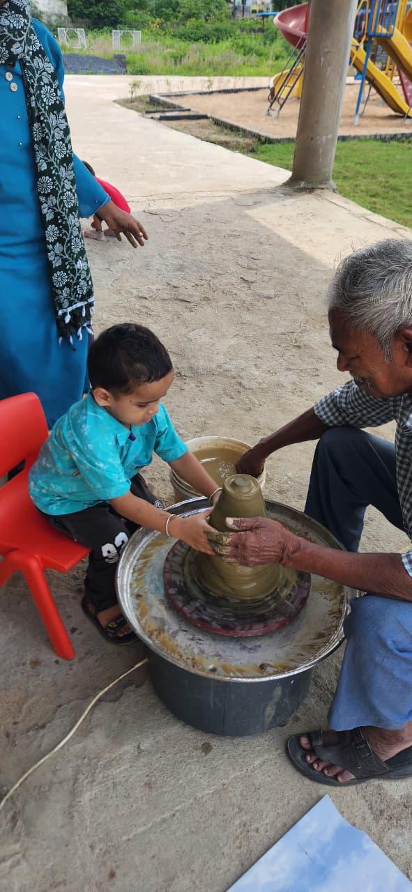 Children experienced the joy of shaping clay on the potter’s wheel, learning patience, focus, and imagination while creating beautiful forms with their own hands. Activities like pottery not only enhance fine motor skills but also nurture creativity and appreciation for Indian crafts.