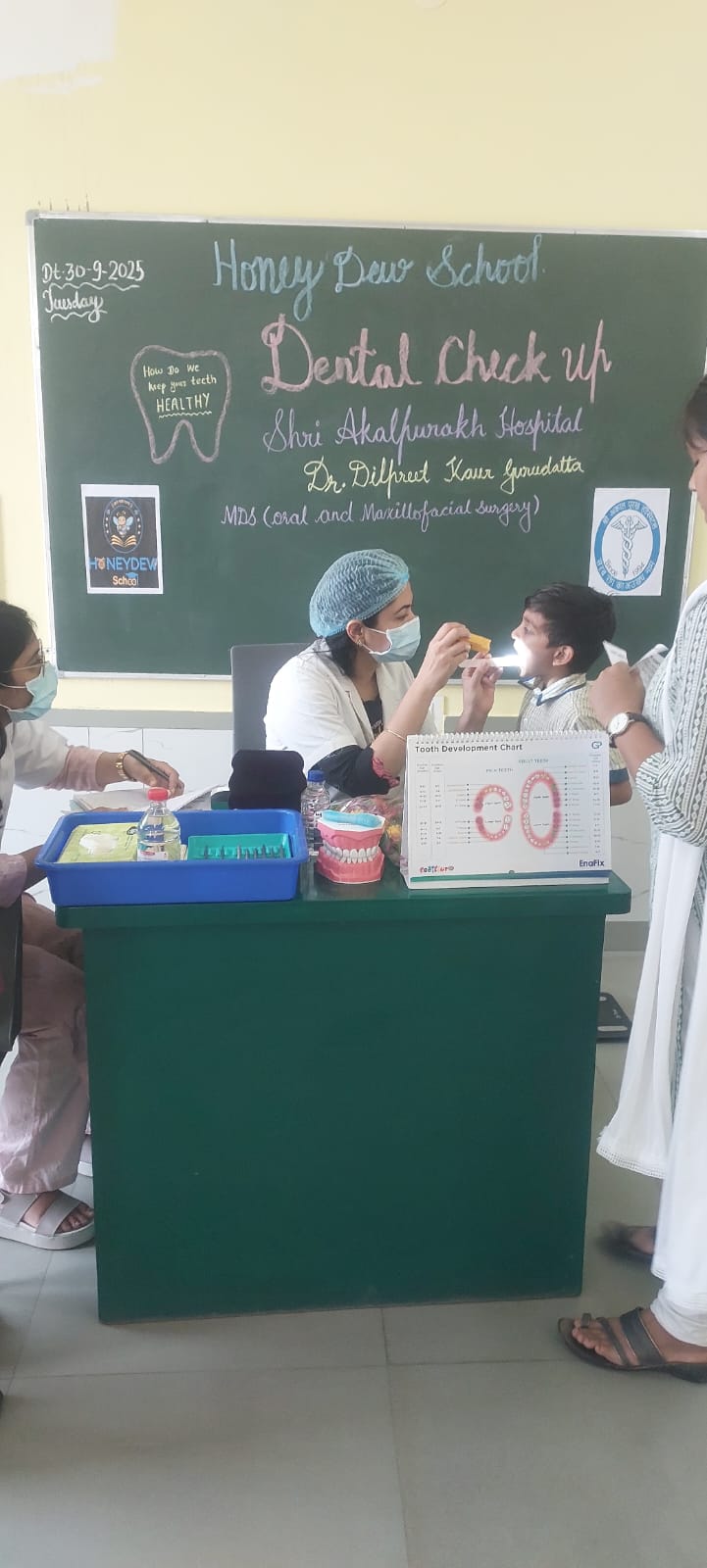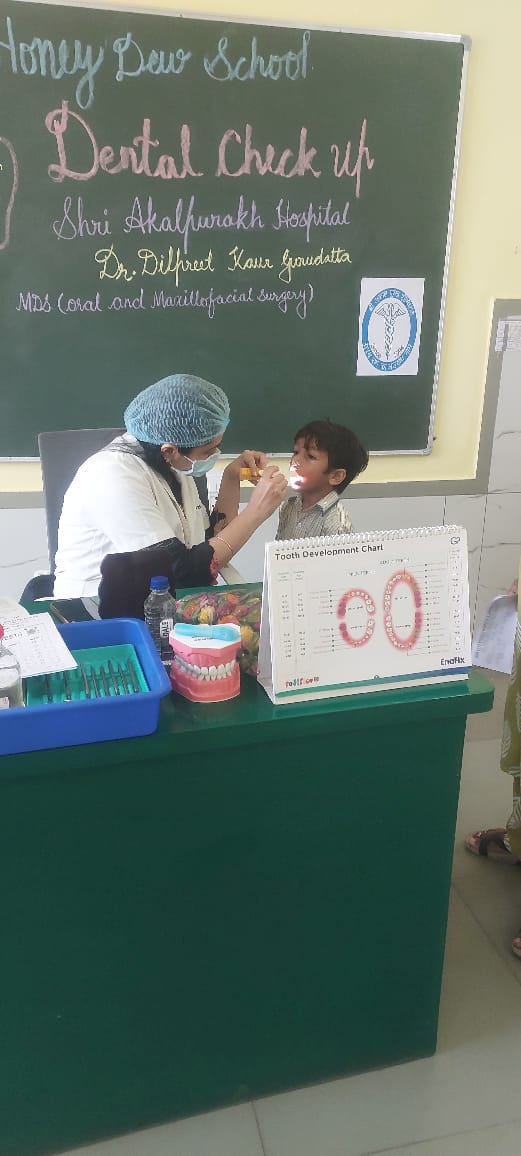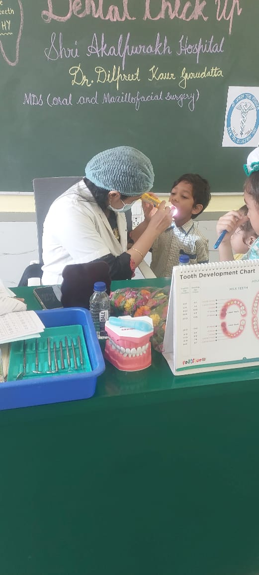 The camp was conducted by Dr. Dilpreet Kaur Gurudutta (MDS – Oral and Maxillofacial Surgery, Shri Akalpurakh Hospital). During the session, children underwent dental examinations and received guidance on maintaining strong and healthy teeth. The doctor also educated students about the importance of brushing, flossing, and regular check-ups to prevent dental issues in the future.